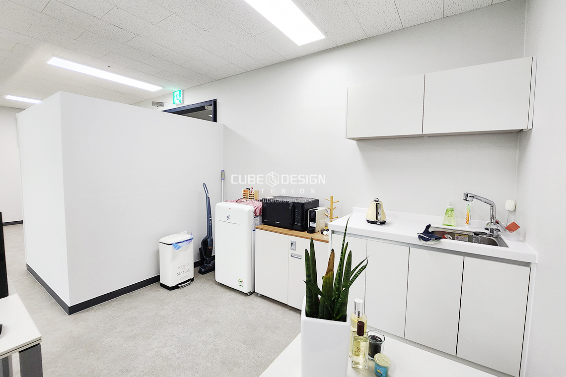 사무실이 넉넉하지않아 오픈형으로 탕비구간을 만들고 소방법에 접촉되지않도록
