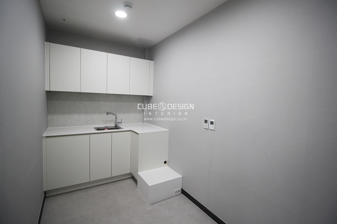 탕비실 내부 모습이에요. 전체적으로 밝고 깔끔한 화이트 톤으로 마감해 공간이 넓고 환하게 느껴지도록 디자인했어요. 상하부 수납장이 넉넉하게 설치되어 있어 직원들이 편리하게 사용할 수 있고, 싱크대와 조명도 실용성을 고려해 배치했답니다. 탕비실은 직원들의 휴식과 간단한 식사 공간으로 중요한 역할을 하기에, 쾌적하고 깔끔한 환경 조성에 특히 신경 썼어요.
