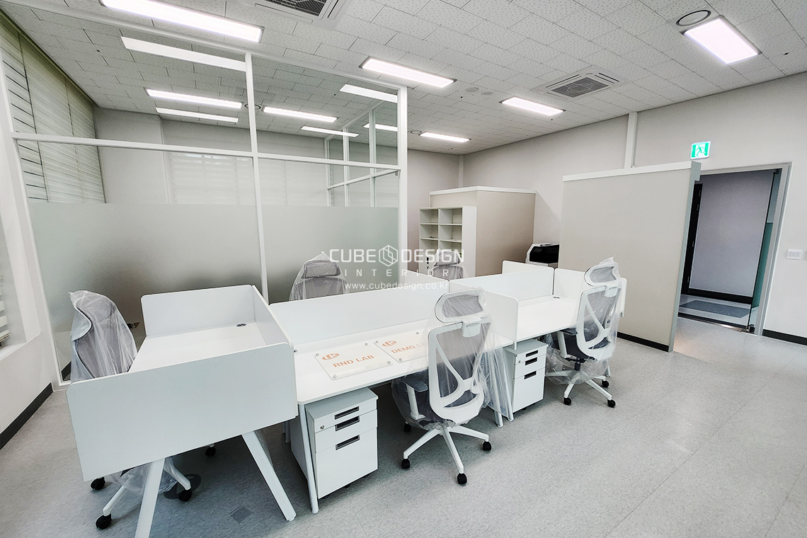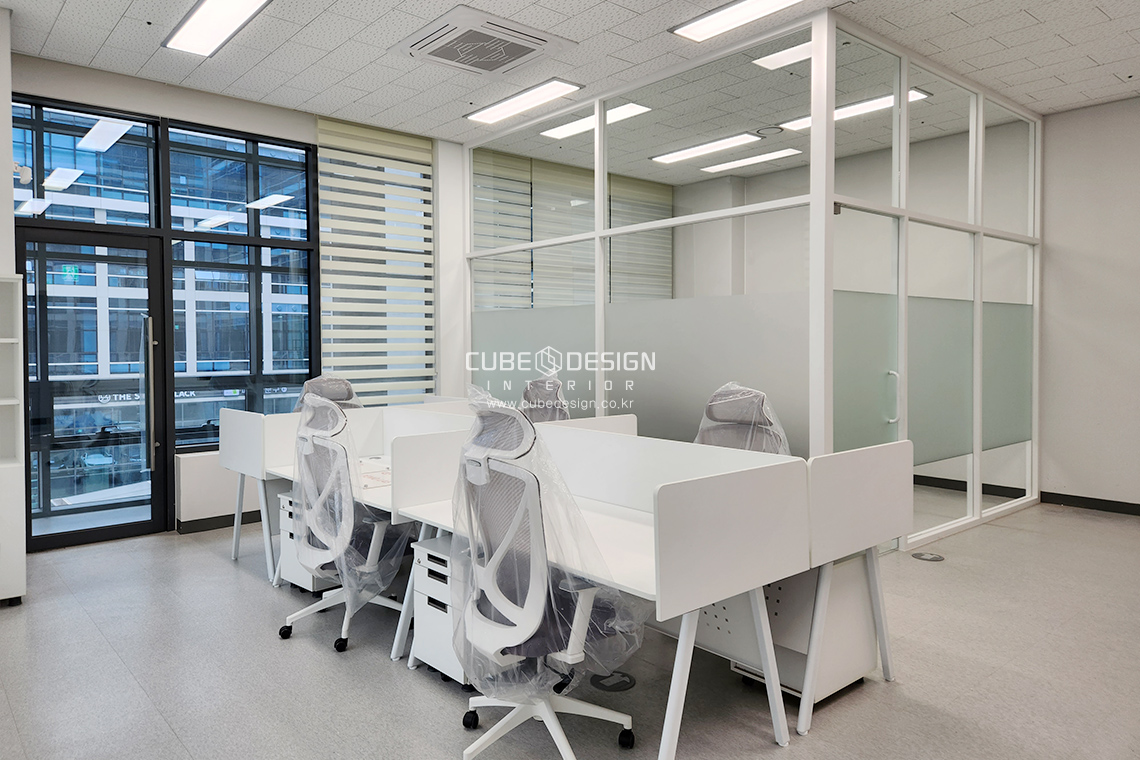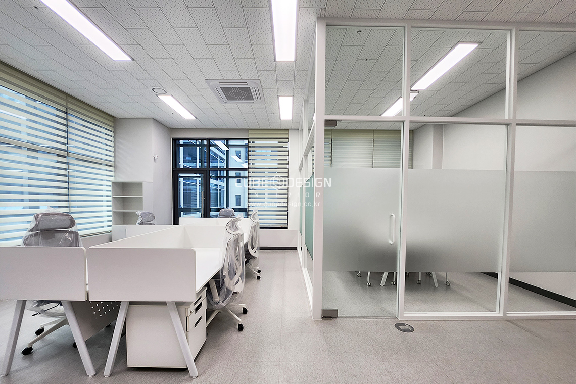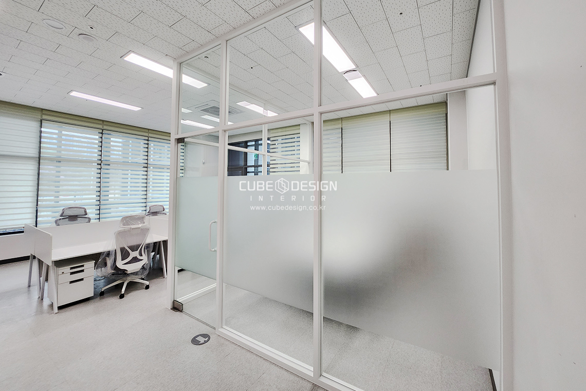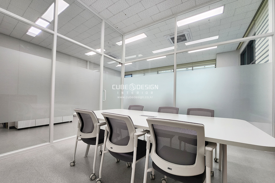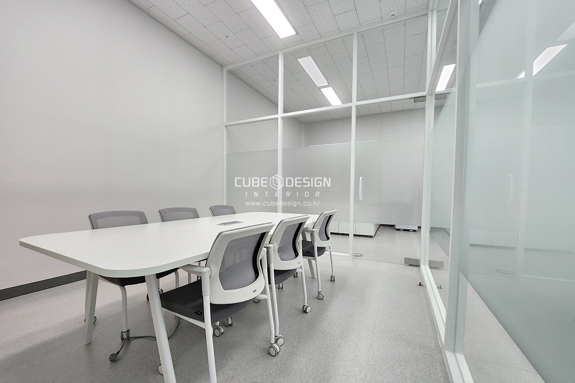 유리틀과 가구는 이질감없이 화이트톤으로 통일하고 엠보시트를 통해 회의실의시선을 차단하여주었습니다.