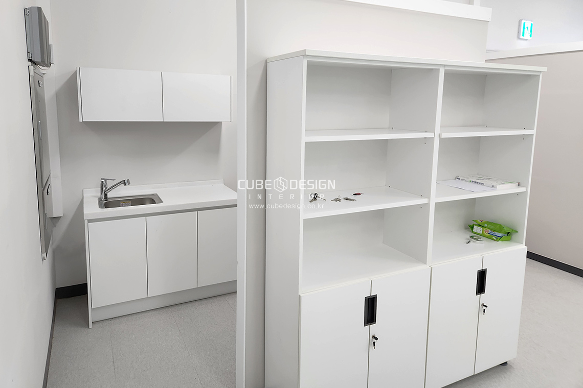 간단한 탕비공간과 기성장을 놓으면서 실용적이며 간단한 수납이 늘어났고
