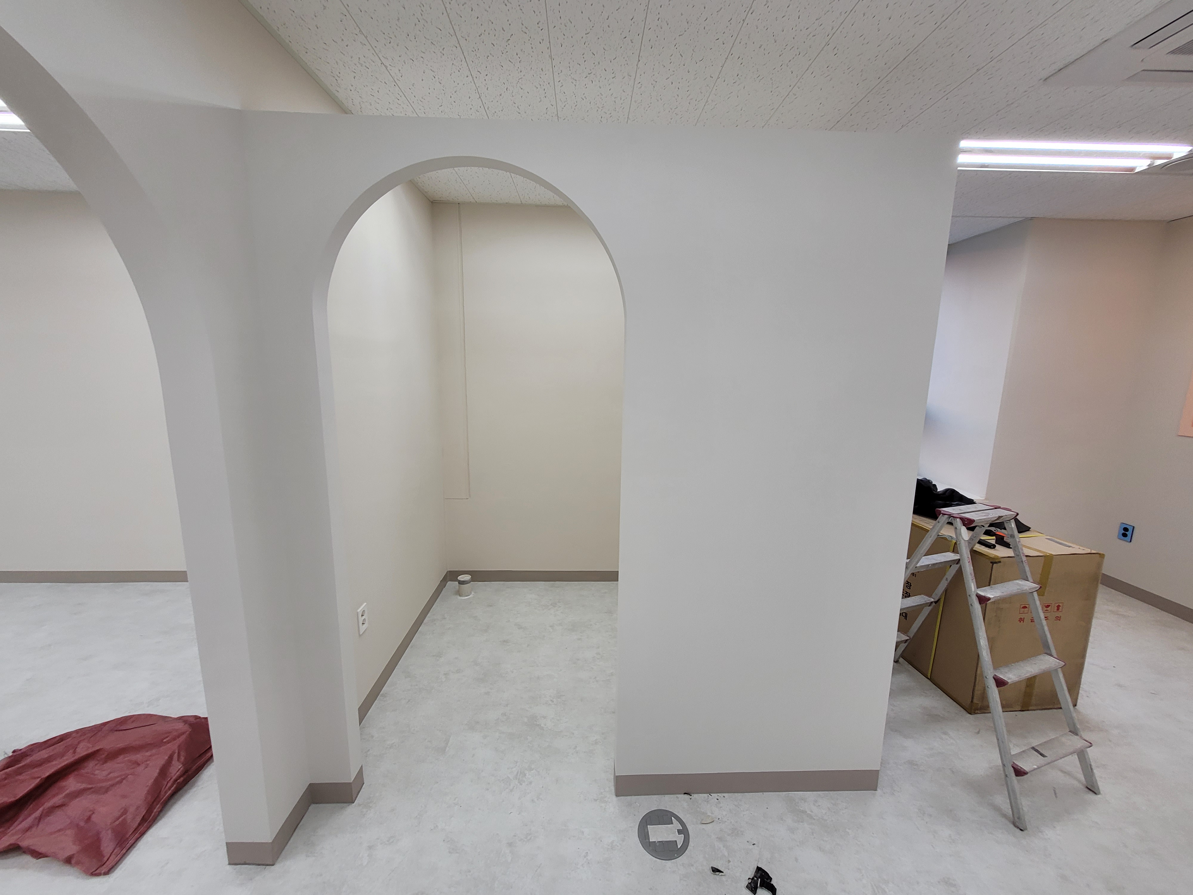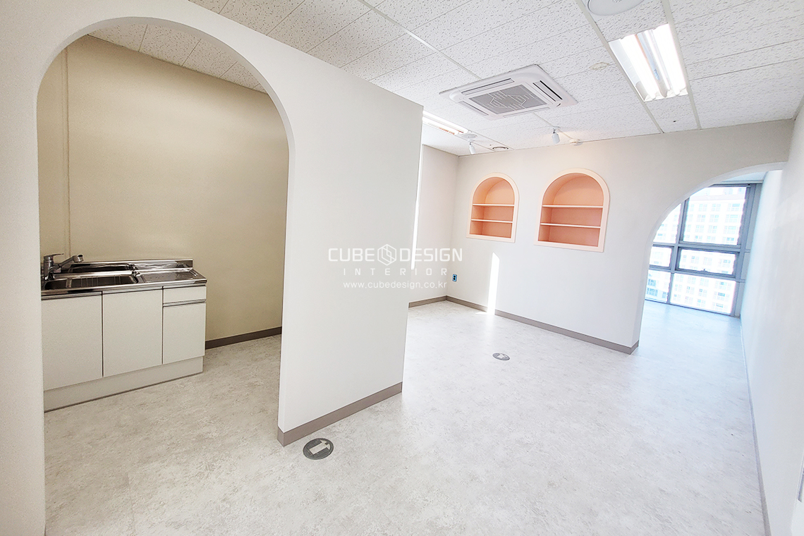 아치형 출입구를 만들어 둥글둥글한 귀여운느낌의 사무공간이 만들어졌습니다.
