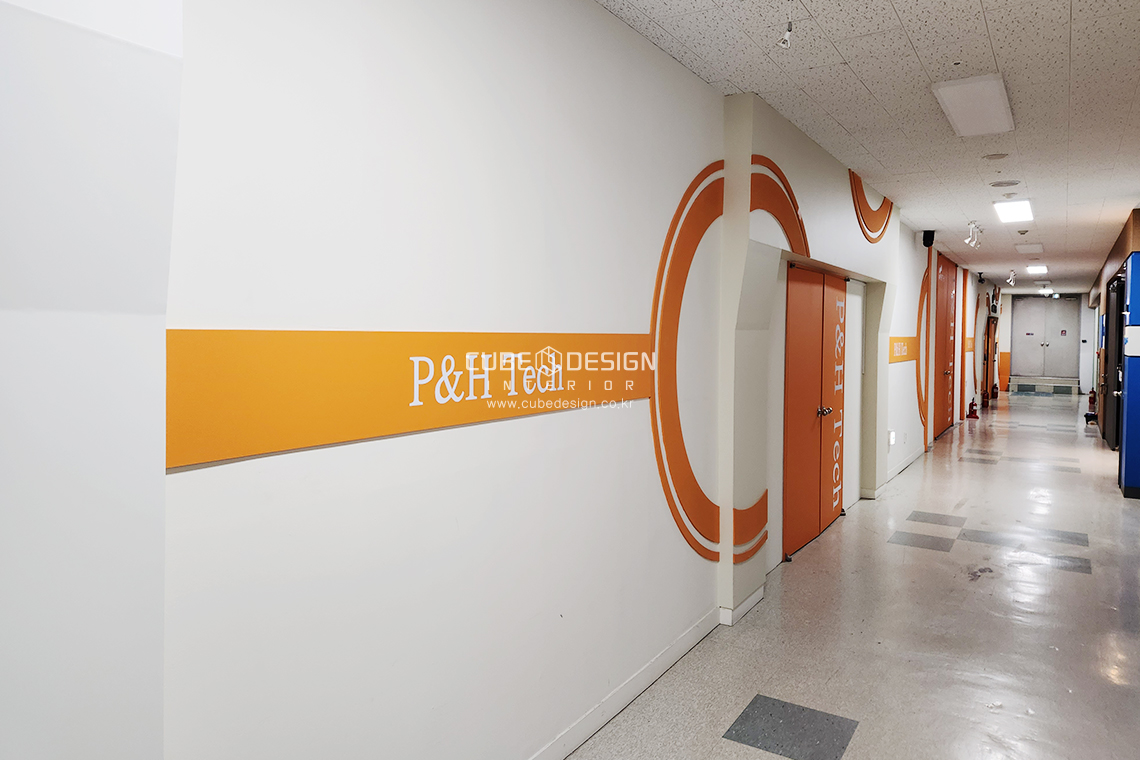 복도 인테리어공사 완료 모습 아크릴 스카시, 시트컷팅 로고 디자인 시공완료