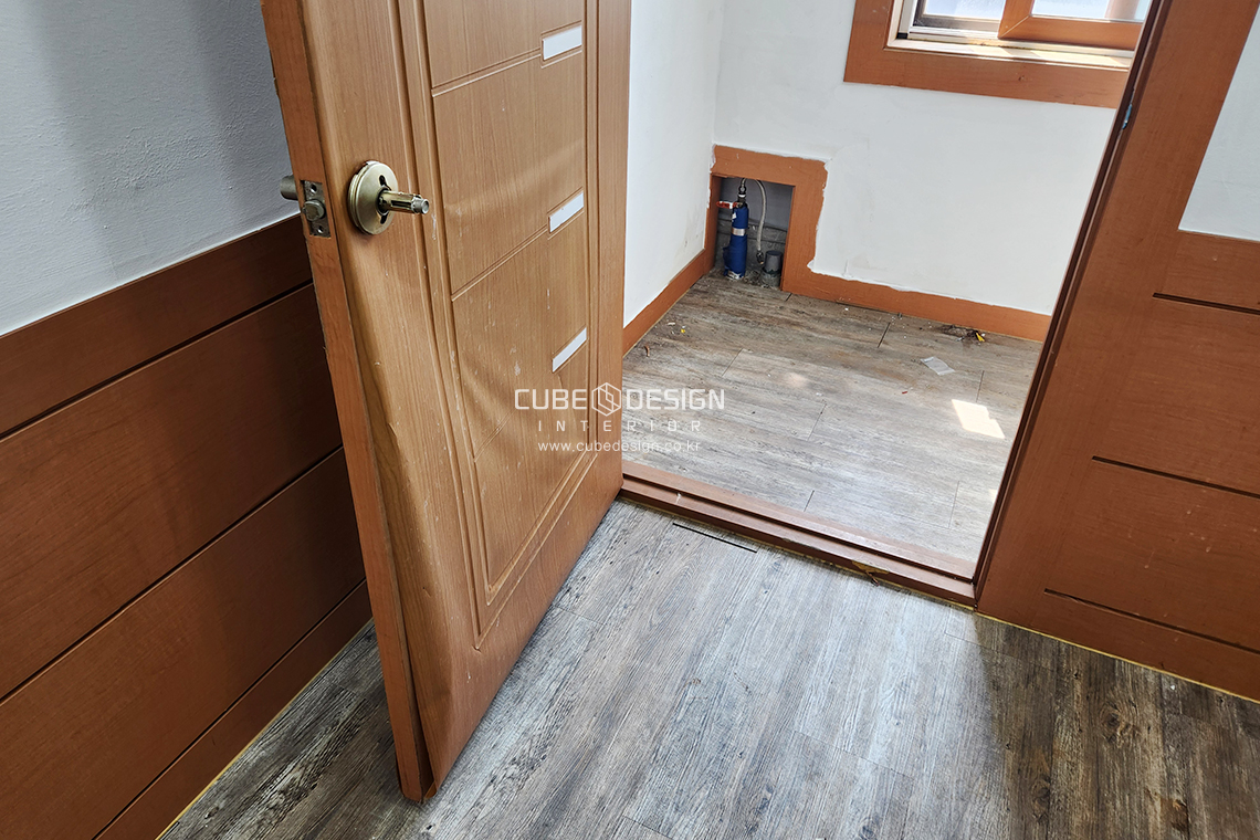 처음 현장을 봤을 때 벽 하부를 두른 진한 우드 패널과 둔탁한 도어가 시야를 막고 있었어요. 그래서 첫 단계로 우드 몰딩과 문짝을 모두 탈거하고, 벽체 상·하부 레벨을 깔끔히 잡아줬어요. 이후 진행된 도어교체리모델링이 이번 공사의 핵심이었죠. 좌우로 공간을 나누던 원목 도어를 매끈한 화이트 도어·블랙 프레임 글라스 도어로 교체해 시선을 시원하게 열어줬어요.