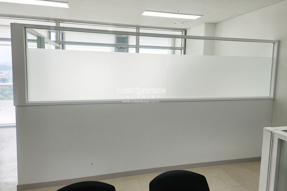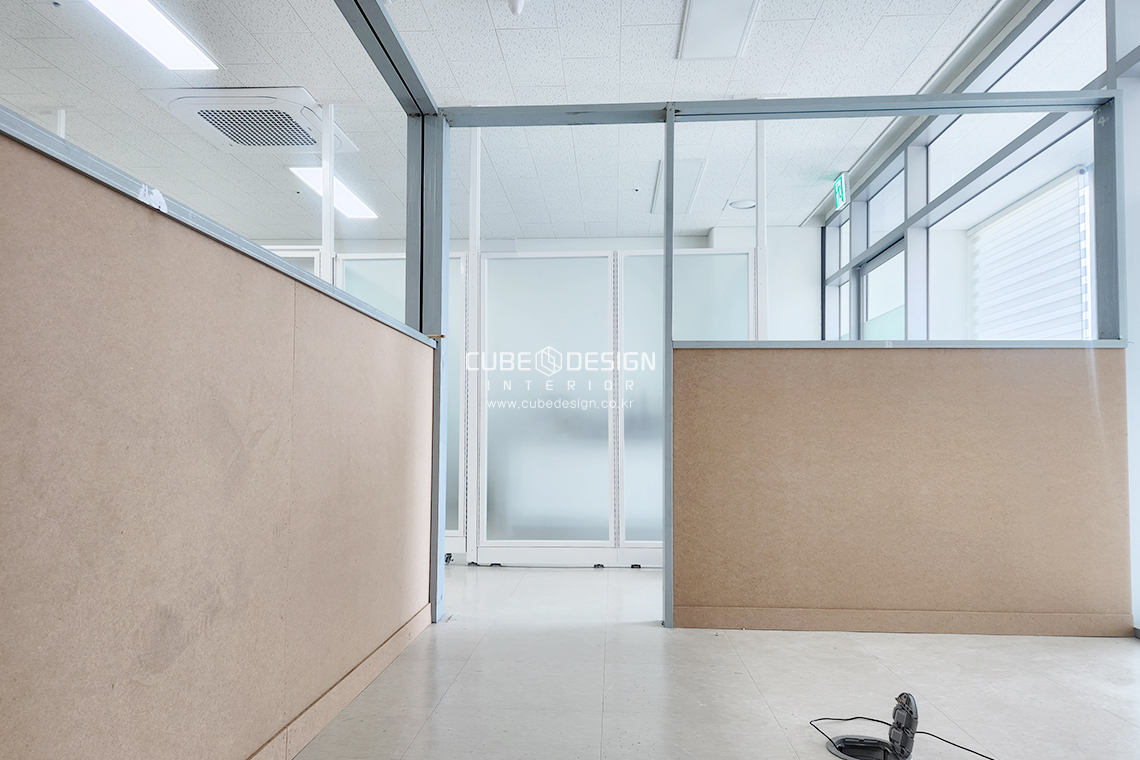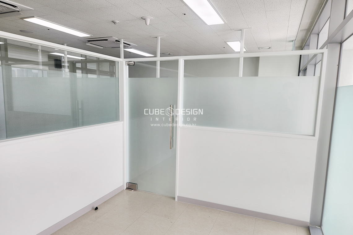 골조 위에 반투명 유리 파티션과 출입문을 설치한 모습입니다. 유리 파티션은 개방감을 유지하면서도 사생활 보호가 가능하도록 설계되었으며, 깔끔한 화이트 프레임과 조화를 이루어 모던한 분위기를 연출합니다. 이러한 디자인은 지식산업센터 인테리어 및 소형 사무실 인테리어에 적합합니다.